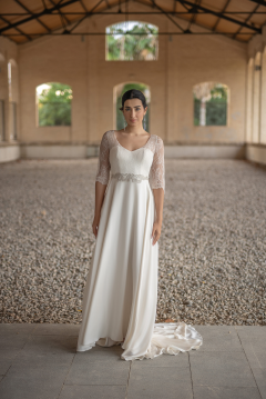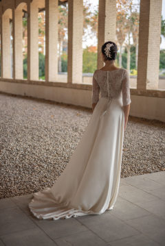 Vestido de novia Leonor. Su cuerpo y mangas en encaje añaden un toque romántico, mientras que en la espalda, el encaje transparenta la piel. Se cierra con una fila de botones y una discreta cremallera invisible. La falda, confeccionada en crepé con corte evasé, culmina en una amplia cola.