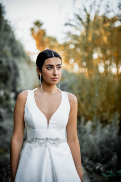 Este sofisticado vestido de novia combina un corpiño de mikado con escote corazón y delicada transparencia en tul, ofreciendo un estilo sexy y elegante. Los tirantes terminan en una espalda ilusión adornada con motivos de encaje, y se cierran con botones y presillas hasta la cintura para un ajuste perfecto. La falda a tablas, también en mikado, aporta un toque de fluidez y sofisticación, haciendo de este vestido la elección ideal para una novia que busca destacarse con gracia y refinamiento en su gran día.